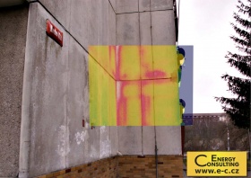 Na obrázku je panelový dům v Plzni. Na termovizi jsou patrné nejen spáry mezi panely, ale i částečně chybějící polystyrén v panelech.